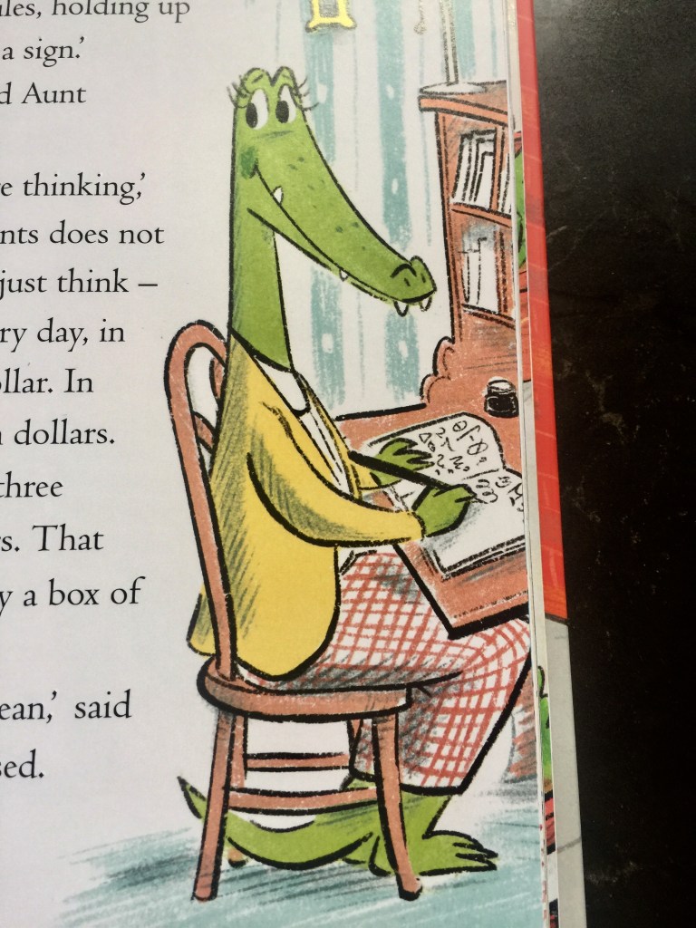 I really LOVE the one of Aunt Alligator writing in her diary in secret code (page 7). Andrew is just the most observant illustrator, I can look at his illustrations over and over again and find more secrets and jokes and touching moments inside them every time. Really brilliant.