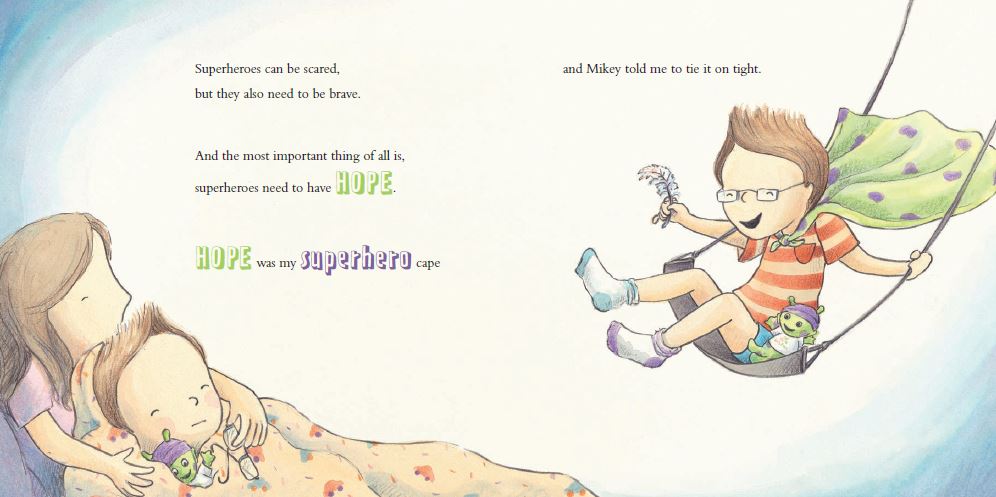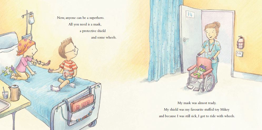 The text is simple, yet profound, allowing the reader to follow Cooper’s experience from diagnosis through to treatment. We are transported into the halls of the hospital and allowed to enter the big cold room with the huge machine. We see Cooper’s body change, he loses hair and grows weary over time but Cooper, a real superhero, never ever gives up.
