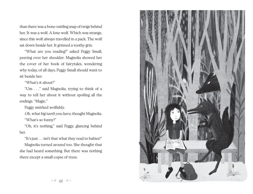 My favourite illustration by the wonderful Katherine Quinn is perhaps where we see Magnolia feeling as though she is lost in the woods with the Big Bad Wolf when she is being taunted by the school bully. I also love the illustrations from the midnight feast that goes wrong in the chapter Midnight Magic.