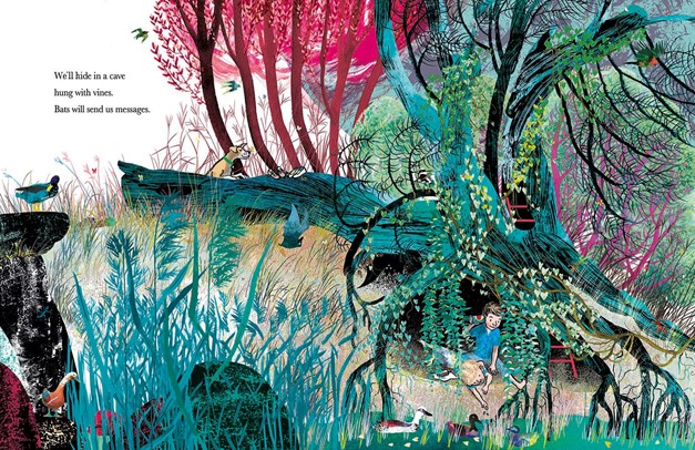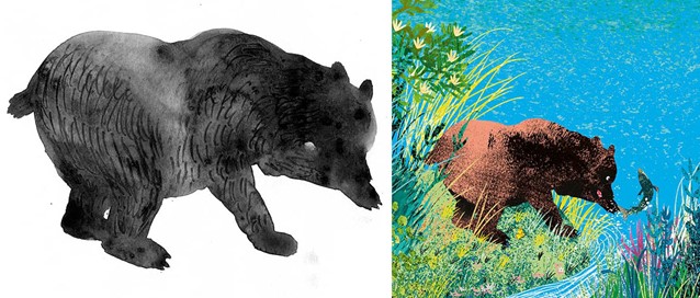 However small, the brothers and their dog are at the heart of every illustration. Their relationship to one another and the world is shown in many ways. I tried to ensure that though their attention may be attracted in the moment by a duck or a bear, they are always aware of each other and sharing each moment, doubling the pleasure, keeping each other safe.
