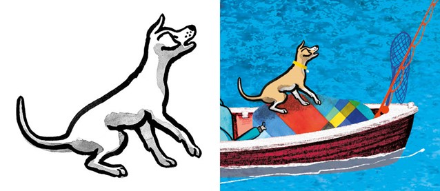 The grasses, water ripples, soil and sand, foam, froth and fur became my textural places, evocative of nature. Wherever I could, I used my hard, graphic edges to create the structure on the page. Sometimes I added something small and fun like a red ladder.