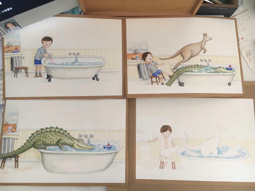 Max: I spend way too much time pulling faces at myself in the mirror to help me illustrate various characters expressions. With this book I wanted to portray different types of personalities and character dynamics e.g. The boy is patient and understanding of the animals invading his bath, the Emu goes from being relaxed in the bath to quite frustrated just as a mum would be having her relaxing bubble bath interrupted, the kangaroo looks after the quoll as a parent or older sibling would do and the thorny devil is just a that – a mischievous little devil of a character.