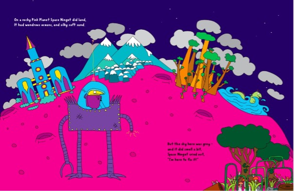 LF: Fix-It Ninget uses humour in the story and the pictures. In the story whenever Space Ninget tries to help it often ends up in chaos which can be pretty funny. When the friends on Pink Planet are building the shed there is a little character called Sushi hanging from a rope from the sky. It makes me chuckle when I add in details like this and I hope kids will find it amusing too!
