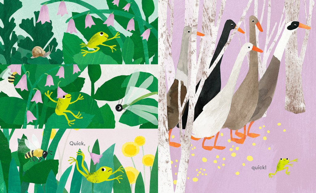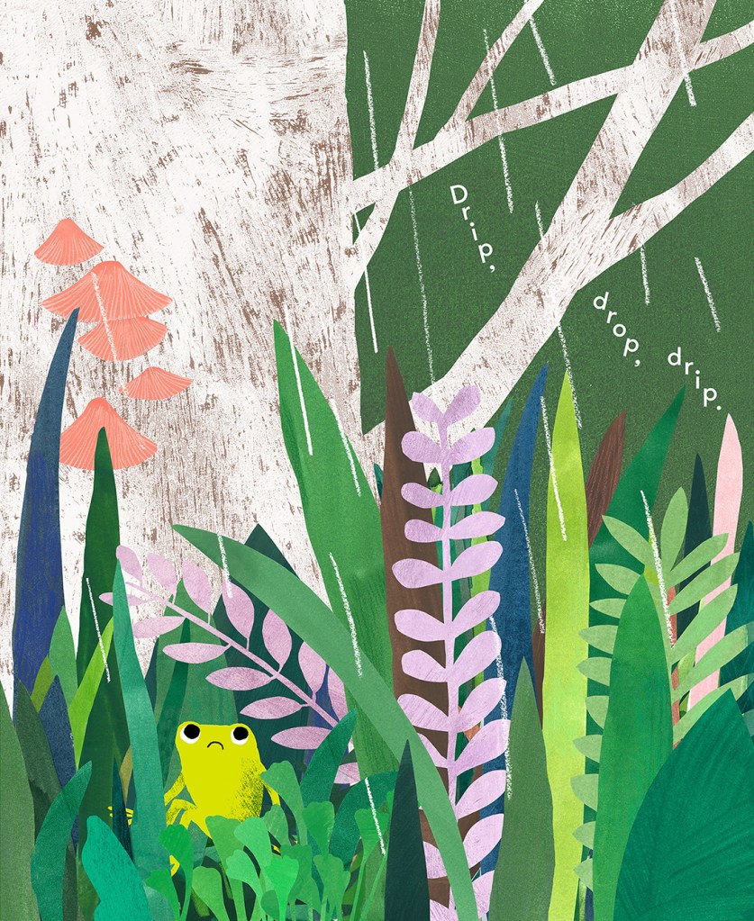 My fondness for inviting endpapers began a long time ago with seeing the illustrated map on the endpapers of ‘Winnie the Pooh’. I remember poring over the map and feeling like I was part of the story before I had begun. I enjoy extending the story of a picture book using the endpapers, setting the scene with a detail that may not be mentioned within the pages. I wanted to show frog alone with those slightly worried eyes as I love that he finds a tribe at the end of the story.