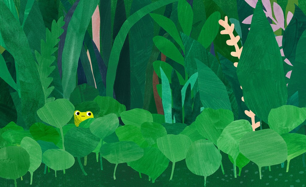 In thinking about the personality of frog, I wanted to capture the delight in this personality and the way a child is curious about the world, seeking new connections. I tried to convey the range of emotions frog would experience from feeling carefree, to alarmed and back to being intrigued by the world again.