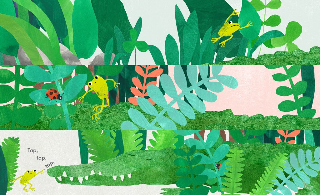 The assortment of animals came from the creatures I was drawing on a family holiday to Queensland where I was sketching brolgas, spoonbills, crocodiles, owls, and fish. At the time I was working on a story centred around a frog and duck which ended on the cutting room floor. But when I thought of the idea for ‘Snap!’ I realised I could use all those animals in frog’s adventure! I wanted different size creatures so that frog could travel up, down, over, under and through. The range of colours and textures in this eclectic family presented fun and creative opportunities!
