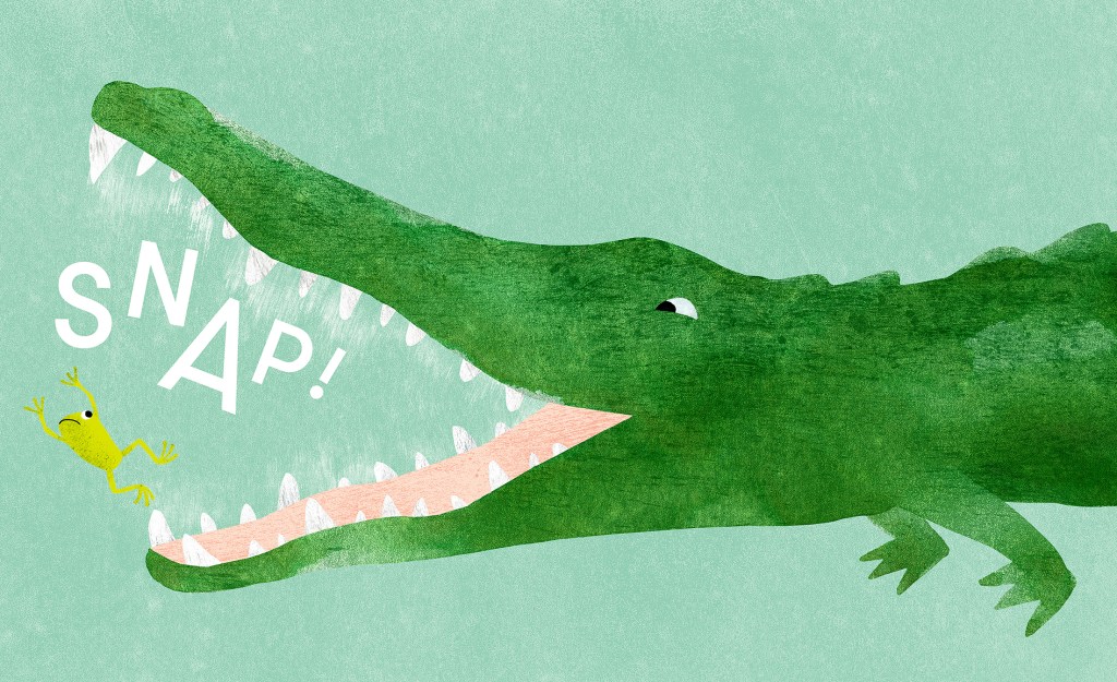 Snap! is an exuberant gem of a picture book for young readers and will also be relished by those who share it with them. It is the dramatic tale of a frog who lands in one scrape after another but is told and illustrated with such warmth, playfulness and humour that, although they will enjoy the frisson of danger, children will know that the frog will always be safe in this story.