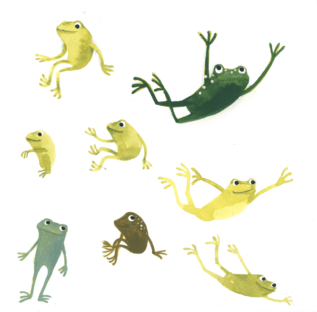 I painted hundreds of frogs, beginning with more realistic watercolour characters – slowly stripping away detail but trying to retain the movement and character.