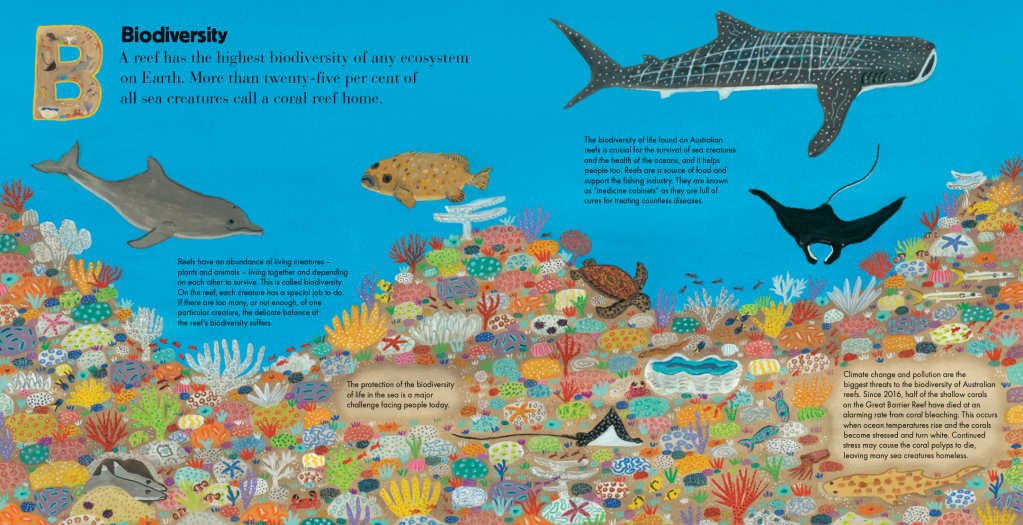 The ‘B – Biodiversity’ spread was a vital inclusion. The challenge was explaining what biodiversity is in simple language. If children are more aware of the fragility and threats to our coral reef systems and the delicate balance of how sea creatures live and depend on each other to survive, they are more likely to help protect them in the future.