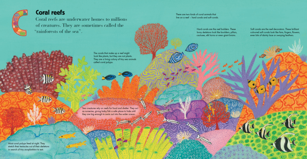 ‘C – Coral Reefs‘ is a spread I’m proud of. Creating details in the picture makes the reader slow down and notice the small things, the pattern on the fish and coral and the ability to spot tiny schools of fish. Allowing viewers to explore and discover in their own time is the gift I wanted to impart.