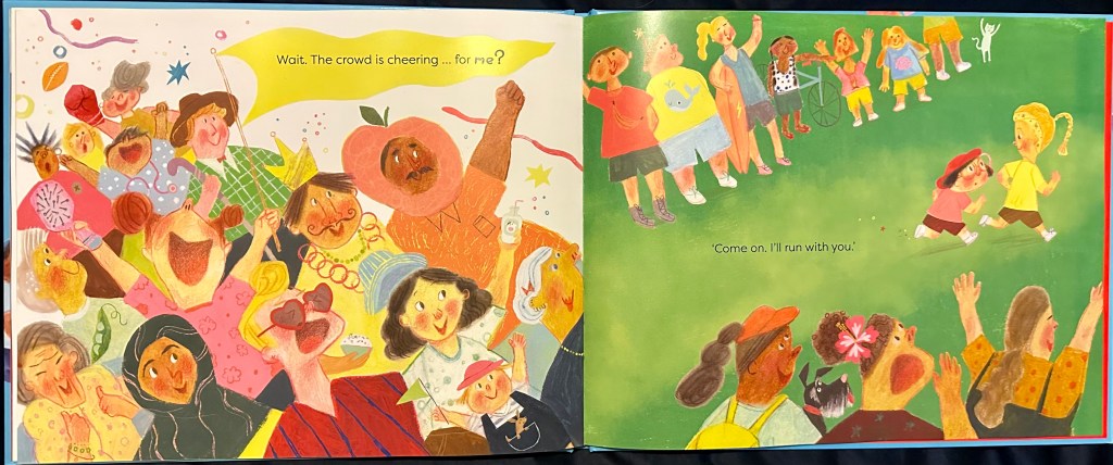 In my very first go with this manuscript, this line also didn’t exist! It was only after workshopping the initial manuscript with my publisher did I recognise that Lin needed to decide for herself that she would embrace her nickname and get through the race. Young children often crave agency and control because so much of their lives is dictated around them, what they eat, when they go to bed etc. Lin can’t stop the bullies around her and she can’t hide away and not join the race, but she can decide on her own mindset and how she approaches situation. And that determined face Freda has drawn shows her fierceness and determination, the moment she makes up her mind that she will finish even if she finishes last. I am so so in awe of how wonderfully Freda has captured Lin’s determination with simple shapes for Lin’s features.
