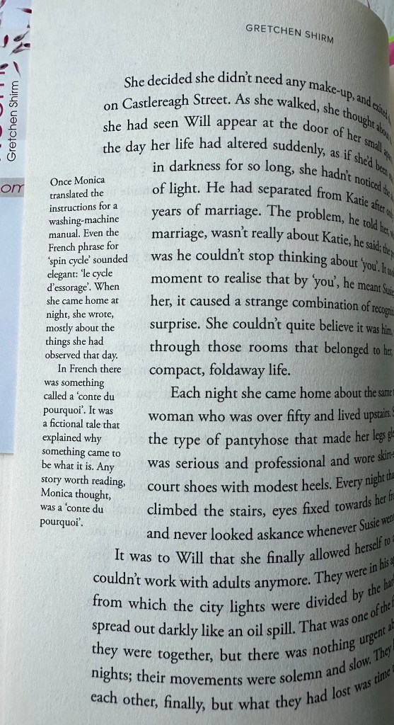 The idea for the margin notes came from a book called The Trick is to Keep Breathing by Janice Galloway. I read that book back in my twenties and the margin notes she’d used had always stayed in my mind. They were a bit different to The Crying Room, in that they were fragments and were kind of incidental to the narrative itself. When I was writing the Crying Room, I thought ‘Hmm I wonder if I could…’ And then I wondered if I dared to because it seemed so unusual, but that’s how it started. Ultimately, I think Monica is the character who brings the book together, and I guess from a technical point of view, having the marginalia allowed me to introduce her book and disperse it throughout the book.