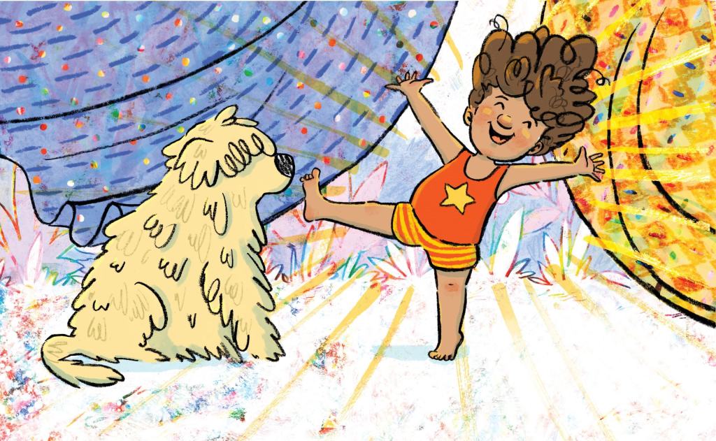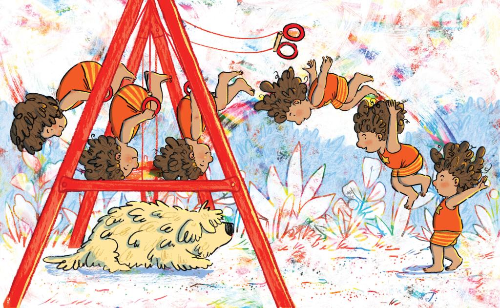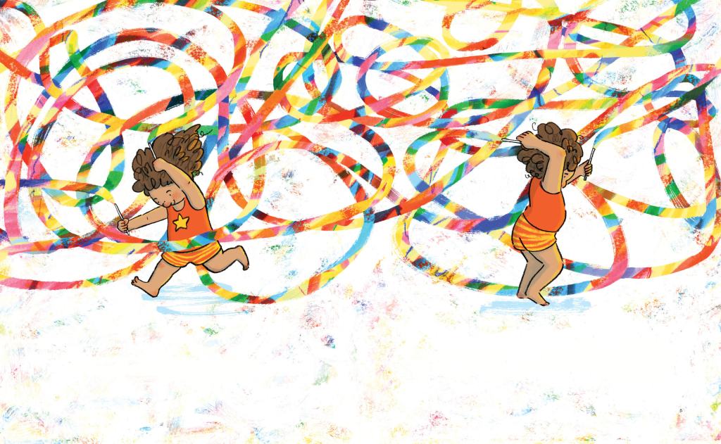 Yes! They did! Once I had the text, I asked them to perform it all for me. We pulled out the ikea gym mats and they did all the things Gymnastica does in the book. I filmed them performing and used that to devise the illustrations. I also tried to capture the spirit of this in the illustrations, the colourful, buzzy energy is captured by the illustrations being imperfect. The white space isn’t totally white, the lines aren’t fully closed, the ribbons have rough edges. I also had my children help me create some of the colourful squiggles you see in the under-layer of the illustrations.