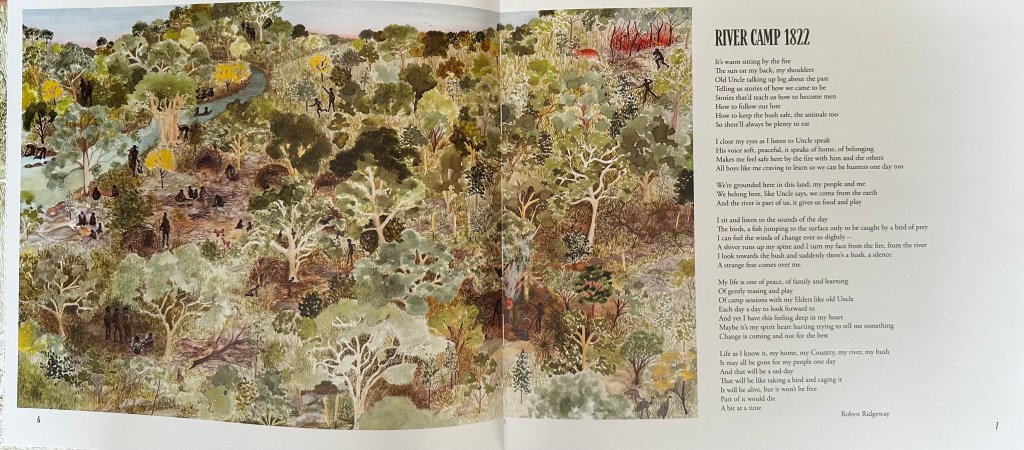 Read Robyn Ridgewayās poem on page 7 (see above). What does it say about life in 1822? What emotions does it elicit? How does it foreshadow a different future? How is the writing style different from the rest of the book? Students could write a response from a coloniser/settler perspective. Or they could create their own version of this scene using watercolours (or equivalent) and ink.