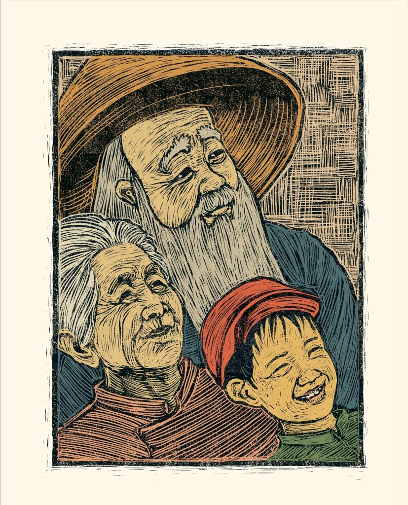 The illustration above from Dragon Folding displays community joy, the importance of beeutiful memories and togetherness and the colour palette contrasted with the grey and sadness of the old man being alone, is evocative. So much is relayed in this illustration.