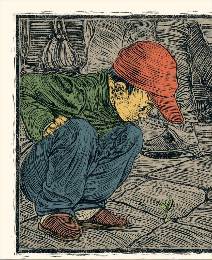 Above is one of Bruce’s stunning illustrations from One Tree that shows the tenderness and care and it is the essence of what this story is about—that little shoot, missed by every shoe and sandal that has walked by becomes the impetus for a forested apartment block. And then transfer that thought to little people … you don’t know what they might do, so protect them and nurture them and give them protection and be patient with them and watch them blossom.