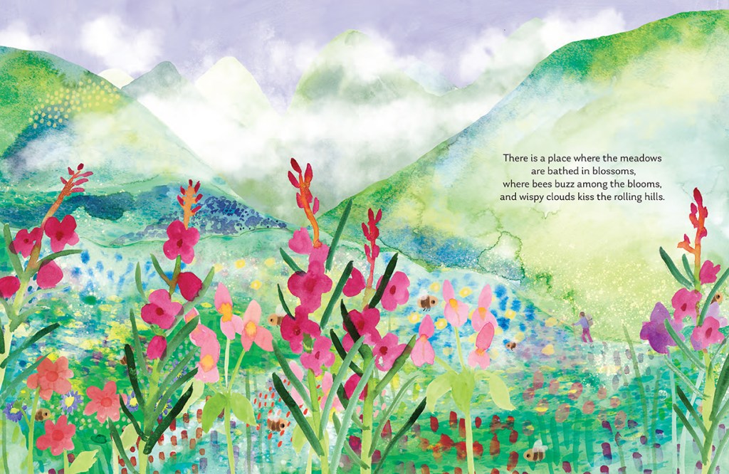 There is a place where the meadows are bathed in blossoms, where bees buzz among the blooms, and wispy clouds kiss the rolling hills.