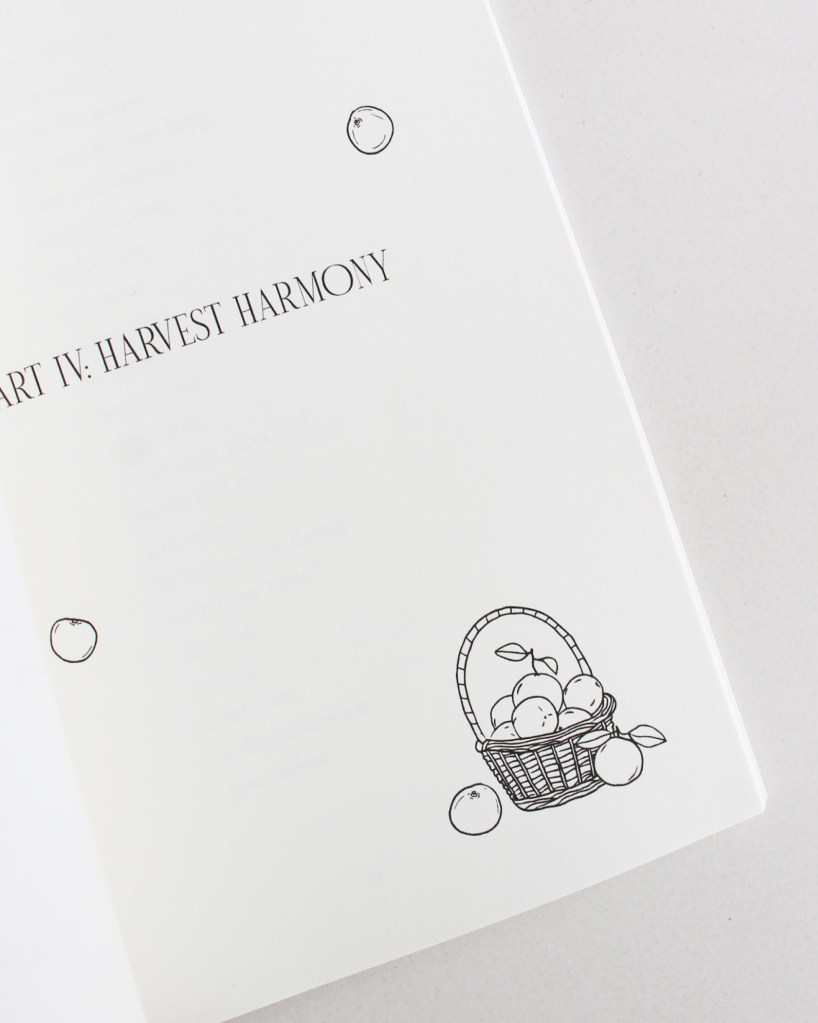 The poems found in this book seemed to almost form themselves, and were collected in the margins and doings of life. They found their way onto the page in the most mysterious, but marvellous, of ways. During this ‘winter’ season, words would appear in my mind. And then would settle in phrases ordered with rhythm and rhyme. Much like a dance is choreographed in counts of eight, stanzas were grouped to form titled poetic pages. And from here the poems began to tell a story of sorts: soil to seedling to growth to harvest to creation. As I started to notice this narrative arc, I began arranging the poems into five parts: Soil and Soul, Seedling Song, Growth in Grace, Harvest Harmony, and Marmalade Melody.