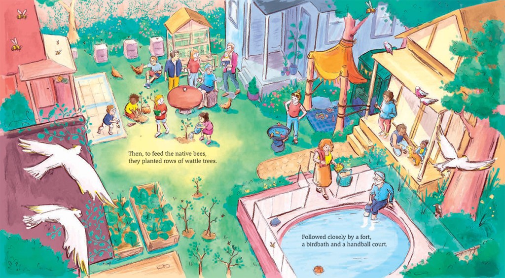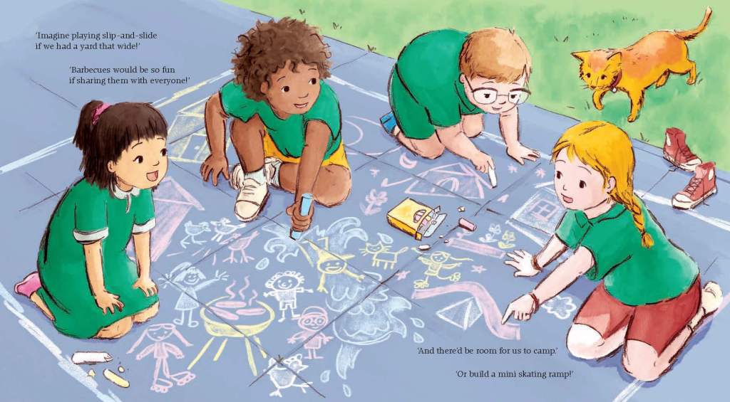 Kirsten: The Big Backyard Plan was inspired by an idea I had as a child. I remember jumping on the trampoline in our suburban Sydney backyard and thinking about all the other houses around us and how they also all had trampolines (and lawn mowers and tool sheds and totem tennis etc) and how most of these things probably weren’t being used very much. I can clearly remember thinking – what if each house, instead of having its own items, shared these items between houses? This seemed like a way less wasteful and more environmentally friendly system to me. So The Big Backyard Plan explores this idea and shows the fun, excitement and spirit that can be felt when families learn to embrace sharing as a way of life.