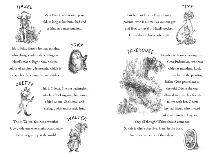 Odette is an enthusiastic pademelon, Walter is a grumpy wombat, Tiny is a sweet honey possum and Poky is a ‘feelings echidna’ who changes colour depending on Hazel’s mood. This morning, Poky’s the colour of mandarins and sunsets. It’s a warm and snuggly colour for an echidna. Hazel is a human child.