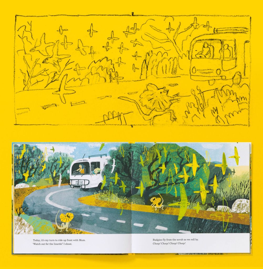 The spread with all the budgies was quite tricky to get right mostly because I wanted the road, the bus and the budgies to be travelling across the page from left to right, and I also wanted the boy to be in the passenger seat hanging out the window, which meant that the bus would have to be facing in the opposite direction.