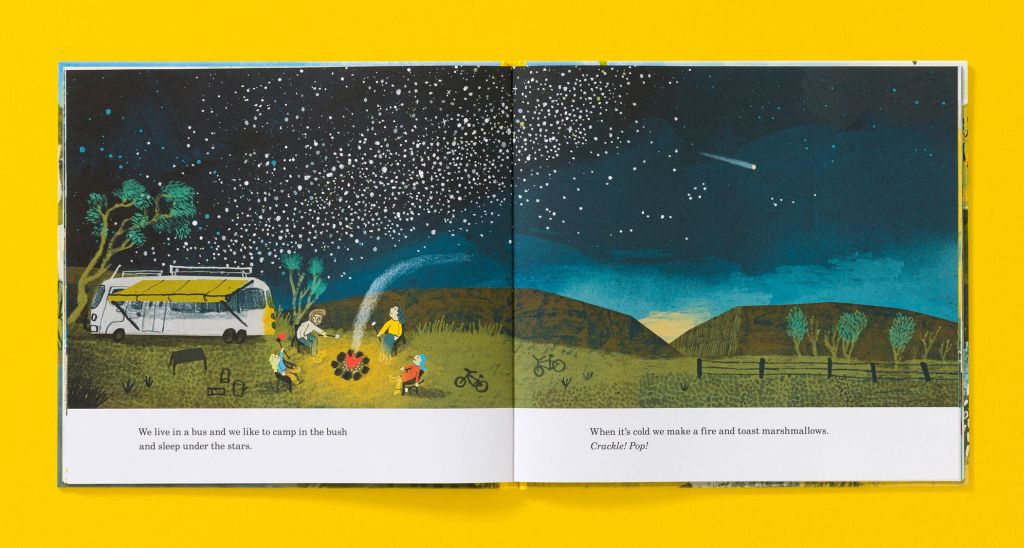 There’s a few, but I think it would have to be the one where the family are toasting marshmallows under a huge star-filled sky. For me, this spread captures that sense of spaciousness, togetherness and wanderlust.