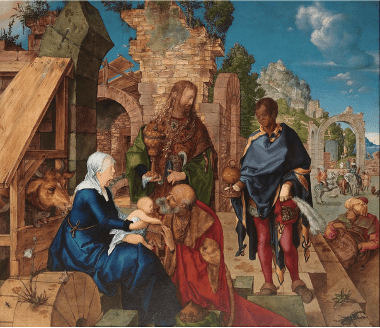 Additionally, I used Old Masters and architecture as references, such as Albrecht Dürer’s “Adoration of the Magi” and the inverted tower, also known as the “initiation well,” at Quinta da Regaleira in Portugal. In creating this world, I sought to bridge the gap between the old, the new, and the fantastical. This creates a tension where the place feels familiar yet strangely foreign