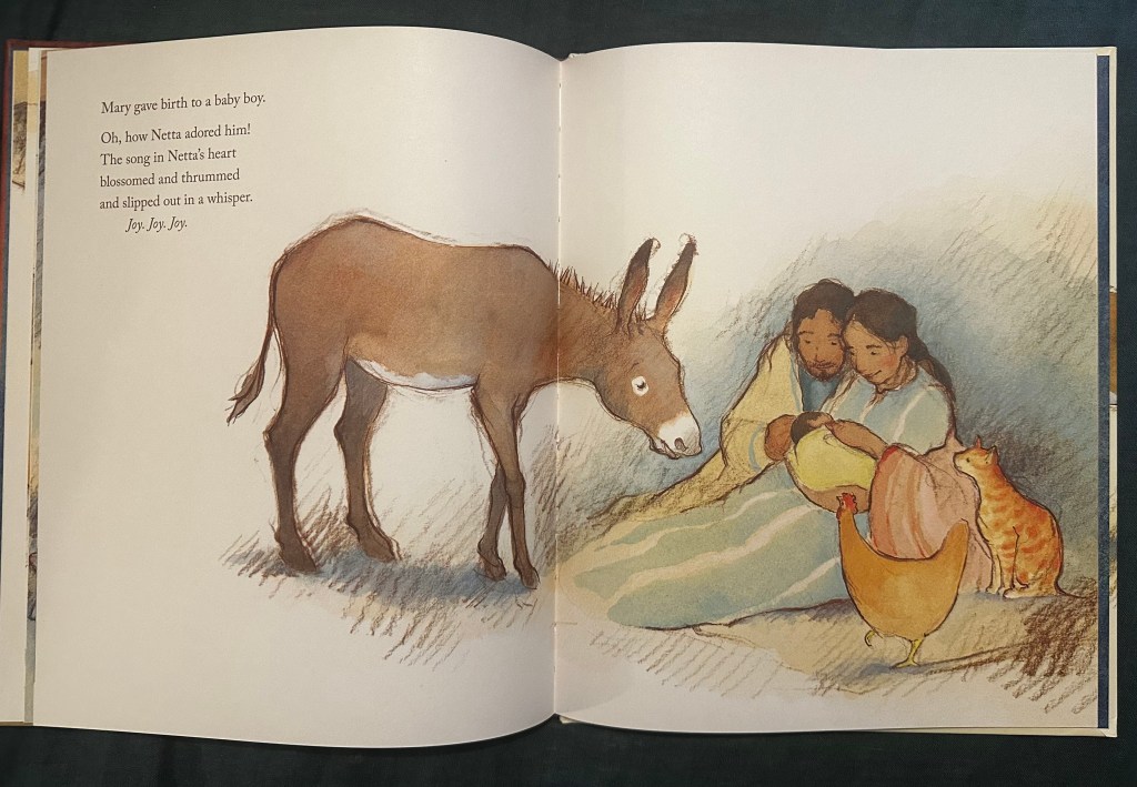 Netta’s new home was safe: Joseph treated her well, and Mary “sang of joy and love and peace”. However, Netta’s song stayed locked in her heart until she travelled with the family to Bethlehem. There a baby boy was born in a stable … The story’s well-known culmination is heartwarming and transcendent.