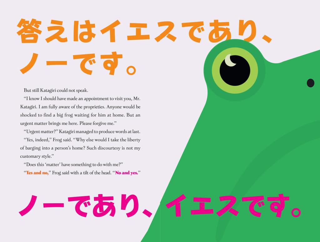“Katagiri found a giant frog waiting for him in his apartment … I have come here to save Tokyo from destruction.”(Super-Frog Saves Tokyo)