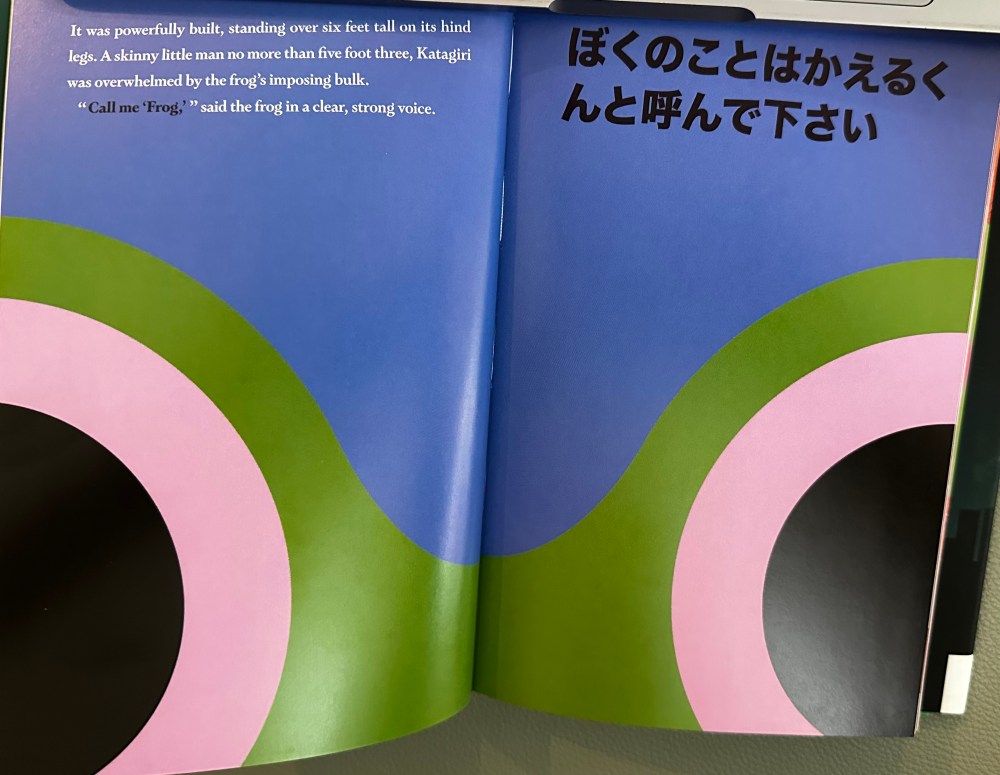 First published in 2001 as a response to the 1995 Kobe earthquake and in 2025 as a beautifully produced hard-cover gift book, Super-Frog Saves Tokyo is intended for adults (not for children). Translated from the Japanese by Jay Rubin, it is superbly illustrated and designed by Seb Agresti and Suzanne Dean. The atmosphere and tone are enhanced with psychedelic, geometrical shapes (particularly circles), collage and Japanese writing characters.