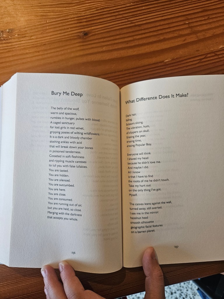 The book was written in poetic fragments that I built into a book. I’m not sure I had any choice with the form, it is simply how it came out. While the book is fiction, it is based on my own experiences, and writing in a fragmentary way was less traumatising than having to stay in the space in a sustained way.