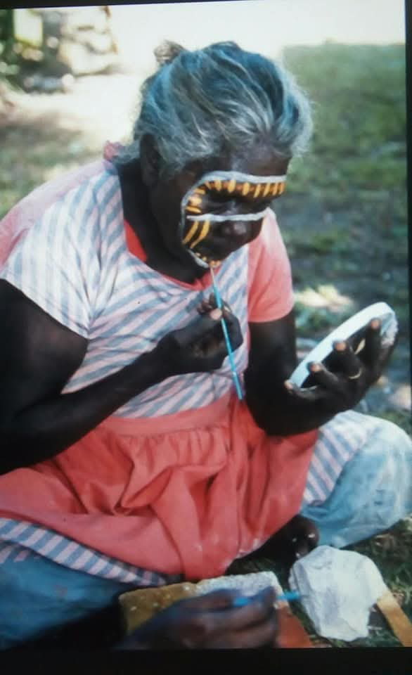 The rainbow is Ambiji, the Rainbow Serpent. Mangatu Lake, Louie’s Country, is where the Ambiji lives in the Dreamtime. The waterlilies are from Mangatu Lake too.