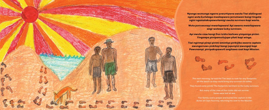 The book uses a mixture of ‘old’ and ‘modern’ Tiwi. The ‘modern’ Tiwi is so that young people can understand it. I tried to keep the translation in Tiwi as exact as possible to the English. The Tiwi matches the English.